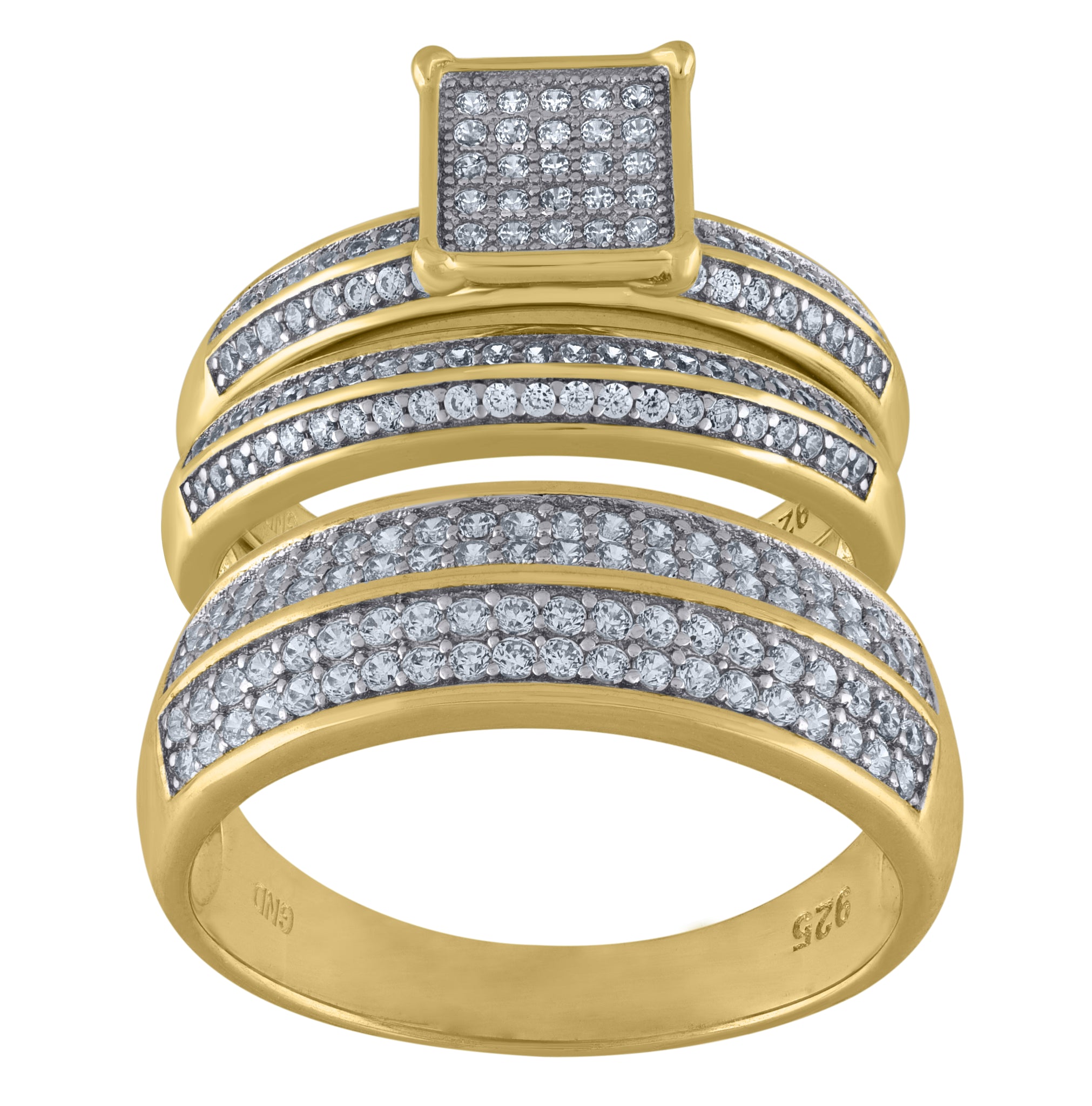 Keene Jewelers 925 Sterling Silver Yellow-Tone His & Hers Cubic Zirconia Square Head Trio Ring Set Size 7