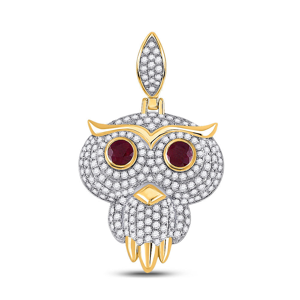 Keene Jewelers 14kt Yellow Gold Mens Round Ruby Diamond Owl Bird Charm Pendant 2-5/8 Cttw